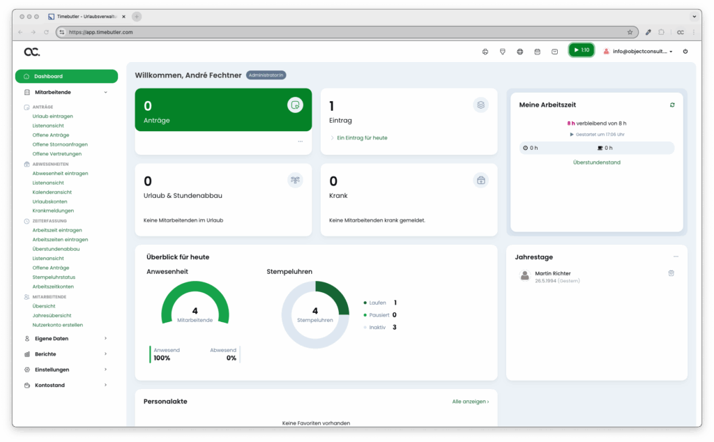 Mit der Personalmanagement-Software erhalten Mitarbeitende ein persönliches Dashboard, das die Arbeitszeiten, Urlaubstage, Krankheitszeiten und Überstunden anzeigt. Keine Unklarheiten mehr – alles ist jederzeit transparent, aktuell und leicht zugänglich.
